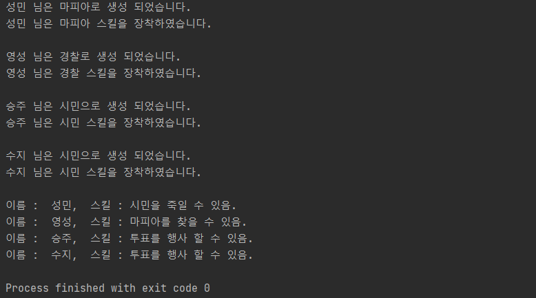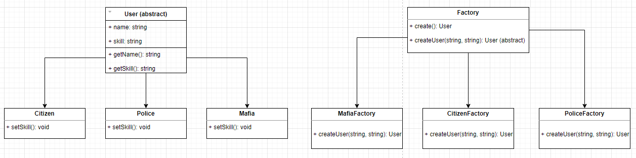 User(사용자)라는 추상 클래스가 있고 이를 상속받는 Mafia(마피아), Police(경찰), Citizen(시민) 클래스가 있습니다.