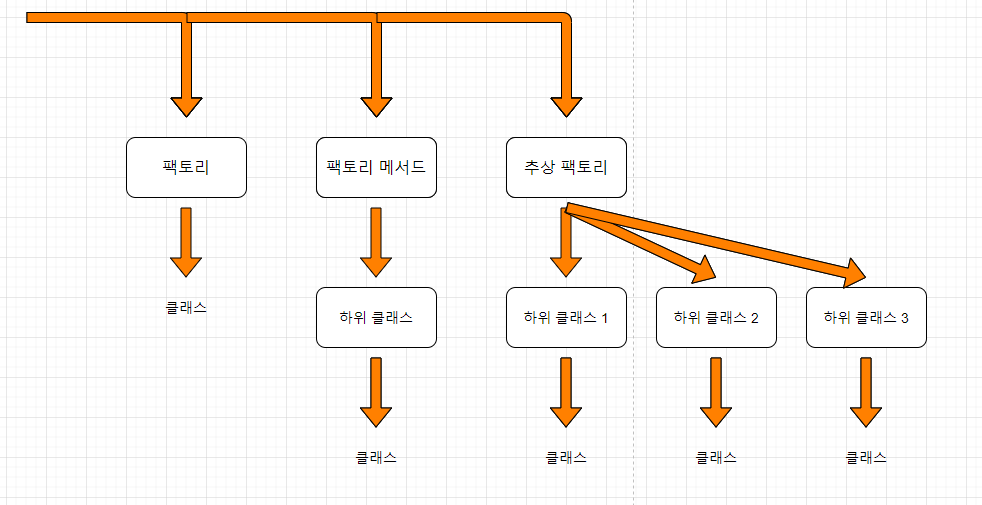 추상 팩토리 패턴 은 생성해야 될 각각의 객체마다 하위 클래스(Factory) 를 생성하여, 원하는 하위 클래스(Factory) 를 결합하도록 하는 방식입니다.