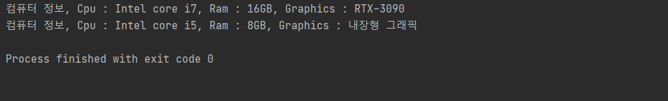 Computer 객체 생성 시 new키워드를 통한 생성자에 각각의 Cpu, Ram, Graphics 객체를 전달하는 것을 알 수 있습니다.