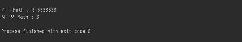물론 Math 클래스 내에 int형 인자와 결과값의 새로운 division을 추가하거나 오버로딩을 통한 추가가 가능합니다.