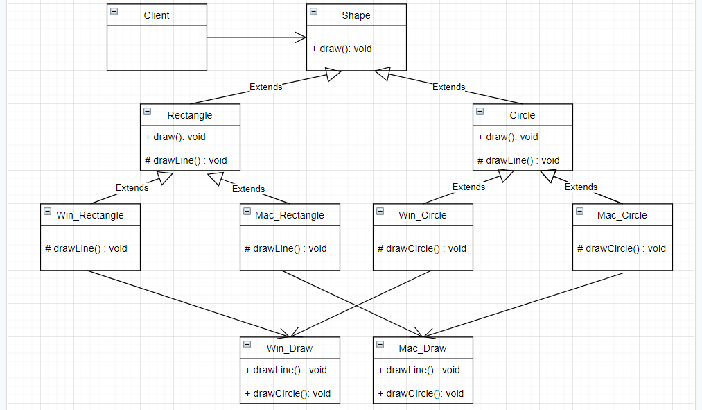 브리지 패턴 으로 재설계됨에 Shape 으로부터 확장할 수 있는 추상부 와 구현부 Draw 를 나누게 되었는데요.
